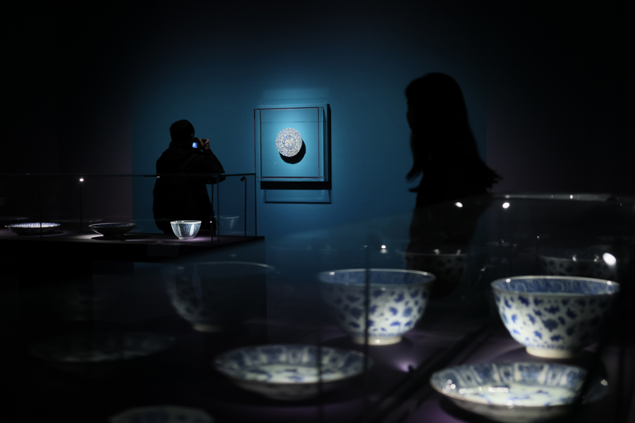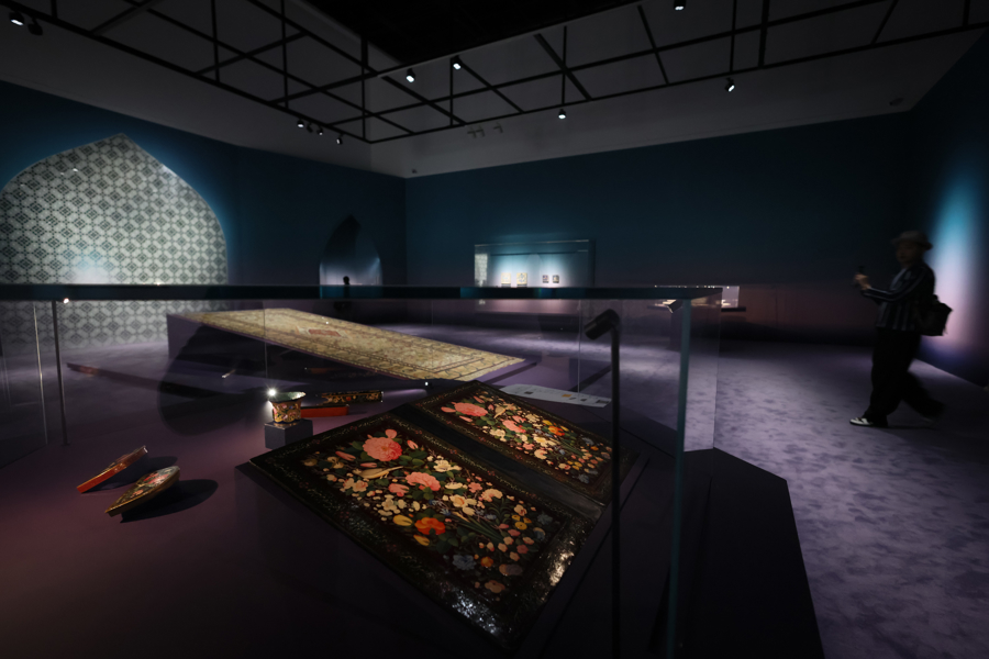 率先开放预展的,是这个展览的第二个展厅,聚焦伊朗艺术。走进展厅,最先映入眼帘的一些展品看得人们格外眼熟。它们颇有些类似中国的青花瓷,其上的纹饰竟然也出现了龙、牡丹等中国传统图案。越往里走,会发现展品越显出异域风情。不少瓷器的底部呈现出金属色彩,看上去闪着微光,图样出现了形形色色繁复细密的阿拉伯纹饰,色彩也丰富起来。“伊朗艺术的确从中国艺术中汲取了很多的灵感,进而逐渐融合本土特色,创作属于自己风格的作品。”赫农说。