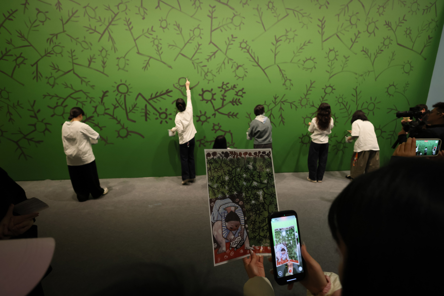 “非常毕加索”展携手巴黎毕加索博物馆带来,揭示颠覆20世纪的现代视觉革命如何在21世纪被当代时尚界传奇设计师保罗·史密斯重新呈现。这是国内迄今最完整、创作类型覆盖最全面的毕加索艺术巡礼,囊括艺术家所有标志性创作阶段的80余件馆藏真迹,涵盖油画、炭笔画、铅笔画、雕塑、水彩、浮雕画、版画、陶瓷等几十余种创作材料。担任这个展览艺术总监的史密斯以其跨界视野与敏锐的视觉语言,为展览注入当代语境下的全新观看方式。展览特别开放的一堵共创展墙,就出自他的巧思——使观众真正意义上“走进毕加索”。只见草绿色的墙面上,浦东美术馆多位工作人员拿起油彩刷,绘着简洁明快的植物图样。这图样,就出自展览的重磅展品之一——毕加索创作于1953年的油画《与玩具卡车玩耍的孩子》中的背景。